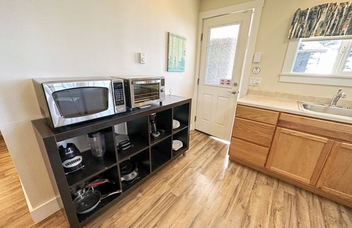 This quaint studio cottage stands alone on the property in building #4. Lined with windows it is a light and sunny room with abundant views of the Pacific Ocean. Relax at the table and do a puzzle, read a good book or watch a favorite movie when not out exploring the sandy beach. After a day of hiking and sight-seeing, curl up and get a good nights sleep in the king bed. This studio has a kitchenette equipped with a microwave, mini-fridge, toaster oven and coffee maker, amongst other kitchen gadgets, so that you can enjoy meals in or go find one of the fabulous restaurants located along the coast. Sit outside on your own little patio and watch the moods of the ocean or listen to the wind in the trees.