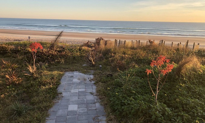 Private home on the ocean on “Millionaire Row.” Ormond’s pristine NO DRIVE beach. Three bedrooms with private access...sliding doors to outdoor patios. Beautiful lawn...87’ of direct ocean front. Enjoy use of our paddle boards, surf boards, ocean kayak and outdoor jacuzzi. Bamboo floors, open kitchen and comfy beds ... 1 king/ 1 queen/ 1 double bed and futon in living room.