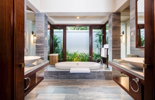 - Open air bathroom with sunken bath, dual sinks and rainfall shower