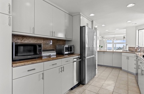 Available for a 3-night minimum, this penthouse nestled in the prestigious Manhattan Beach, this exquisite oceanfront penthouse offers unparalleled panoramic vistas of the Pacific Ocean. Elegantly furnished, this single-story condo features a sophisticated sunken living room adorned with a plush Restoration Hardware Cloud sofa and a charming fireplace, creating an idyllic haven for relaxation. The residence boasts a spacious dining area that comfortably seats 8, alongside an open-concept kitchen equipped with top-of-the-line stainless steel appliances.