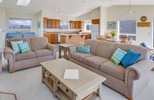 Featuring an abundantly stocked island-style kitchen, you'll be making meals with a view of the beach from a wall of west-facing windows. With the open concept great room, your entire group can be together whether you're cooking up a fantastic meal, sitting down to eat at the dining table or relaxing by the fire on the comfy sofas. Wherever you look, there's breathtaking sights to be seen. The west facing primary bedroom has a beach view, a desk if you need to work remote, and private access to the deck. Enjoy your own ensuite bath that boasts a jetted tub and stand alone shower. Across the hall is another bedroom with a queen bed. It has a sparkling view of the bay and the Alsea Bay bridge, along with its own door to the hall bathroom featuring a tub/shower combination. The pull out sofa in the living room is sized for small adults or children.