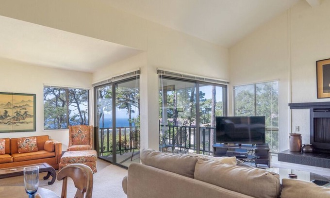 It's all about the view in this third floor condo (a.k.a. "Treetops") which overlooks a broad swath of the Pacific through the Monterey Pines. Comfortably furnished, with views from nearly every room, it has a gas log fireplace that lights with the flick of a switch, a large flat screen TV, and two separate seating areas in the living room. The dining table seats four, and the corner patio overlooks…. well, everything!