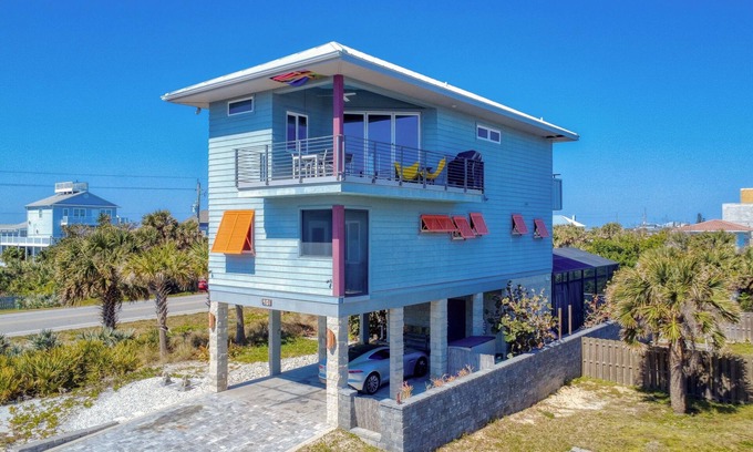 Discover the perfect blend of comfort and adventure in this unique 2-bedroom, bunkbed gallery, 2 full & two half-baths retreat! Nestled just half a block from the beach, this 3-story home offers breathtaking views of both the river and ocean from multiple decks. Relax in the screened lanai with a private pool, or take in the scenery from the balconies. Inside, the home is designed for both relaxation and entertainment, featuring 7 beds: 4 bunk beds, 2 convertible couches, and 1 queen