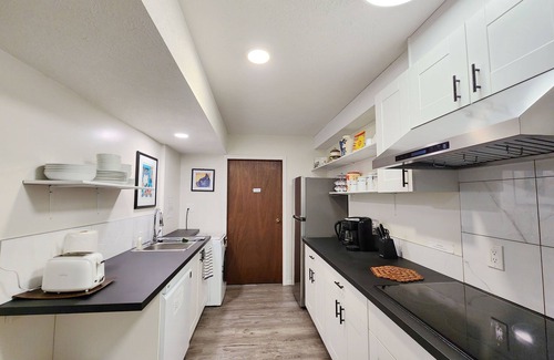The kitchen is fully equipped with most appliances, dishes, and drink sets, making it easy to prepare meals at home. The Dacor electric cooktop allows you to cook up special meals with ease.