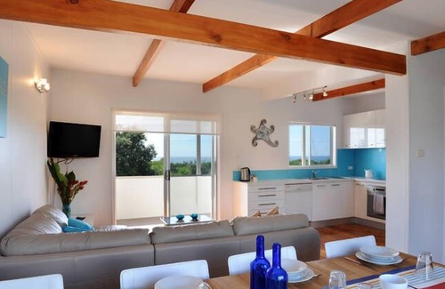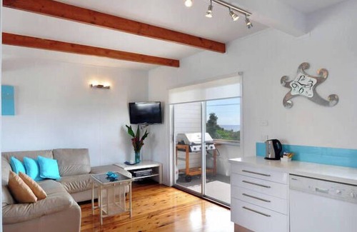 * Back deck with seating overlooking the escarpment and green hills of Gerringong's dairy country