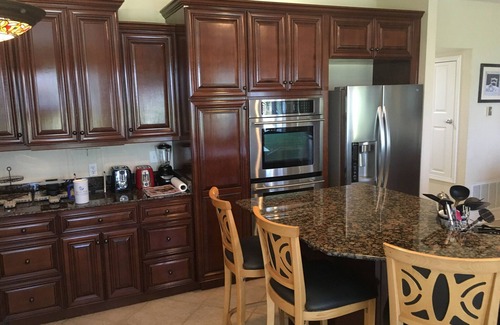 There is another table in the kitchen that will seat 4 or can be used for serving appetizers and side dishes..., or guest can enjoy the large wrought iron patio set for outdoor dining. So with the furniture and distinctive dark maple mitred cabinets and center island, our kitchen is designed for family and fun!