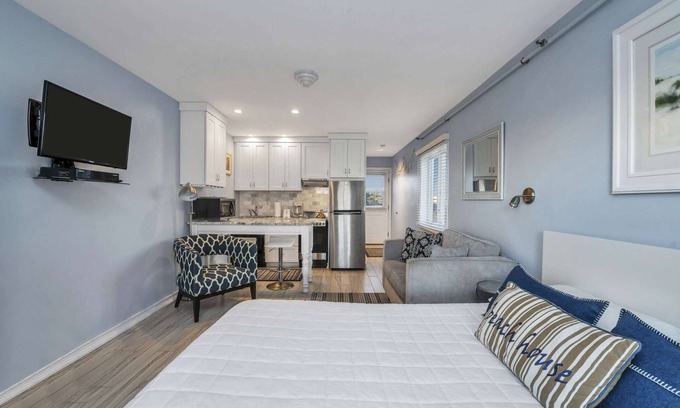 Enjoy a beach vacation in this Ocean theme studio apartment just minutes from the ocean—a perfect stay in the heart of downtown. Relax on the balcony, and take a soak in the tub in the spacious bathroom. Perfect for a couple to escape and enjoy quality time together.
