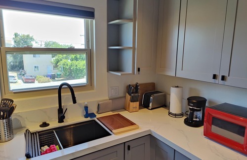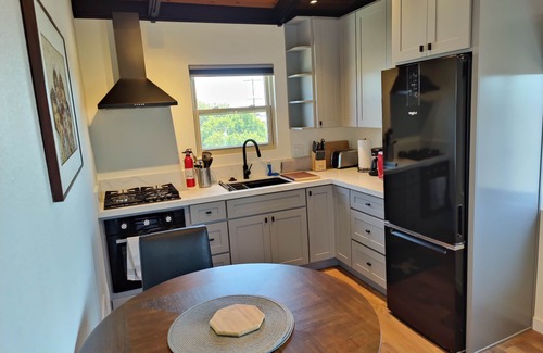 The apartment is very private- you do not share a wall with the main house, and the bedroom faces east and south, so you do not hear or see main house occupants or hear street noise. Inside the door is a small but cozy living room with two chairs, two lamps, a small table between the chairs, a tv, and a small bookcase with books. Beyond the living room is a nice kitchen with full-sized fridge, gas oven and stove, a bistro-style kitchen table and two chairs, and all kitchen accessories- microwave, coffee maker, blender, toaster, knife set, etc. The bathroom is compact, with a decent vanity, a shower with removeable shower head 'wand', and toilet. Light in bathroom has a bluetooth speaker so you can sing in the shower.