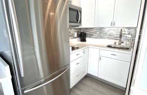 — Modern kitchen (fully stocked!!) with a full-size refrigerator/freezer, microwave, two-burner cooktop, toaster oven (no conventional oven), blender, Keurig k-cup coffee maker, and Brita water filter pitcher