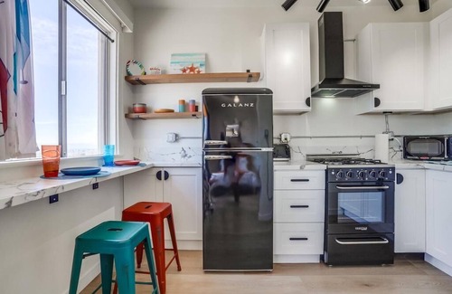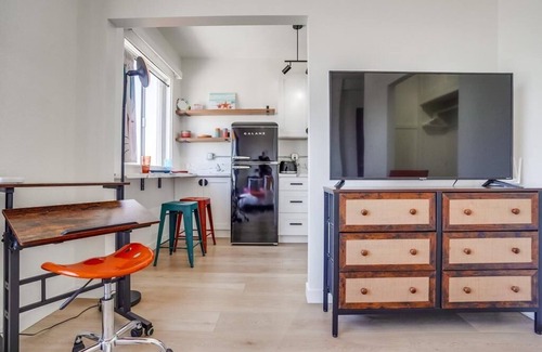 Gorgeous Queen Mary and ocean views from this remodeled 9th floor studio in historic building! Light and bright unit, beautiful kitchen with quartz countertops, newer retro style appliances, newer white shaker cabinets. Breakfast bar for sipping your morning coffee with relaxing ocean views. Modern vinyl plank flooring throughout. Renovated bathroom with new tub, new tile and fixtures, new mid-century style vanity. Closet/dressing area with plenty of storage plus additional large closet. Queen sized bed. Dedicated workstation with space for laptop and printer. Building offers community laundry facilities and beautiful top floor solarium. Secure parking space in covered lot directly behind the building. Fantastic location on Ocean Blvd just steps from restaurants, entertainment, shopping, beach path for biking, running or walking, Long Beach Grand Prix and Long Beach Convention Center. Get inked at the famous Outer Limits Tattoo Shop located at basement level of the building! Oldest tattoo shop in the county. Book your stay now for upcoming events like the Long Beach Marathon.