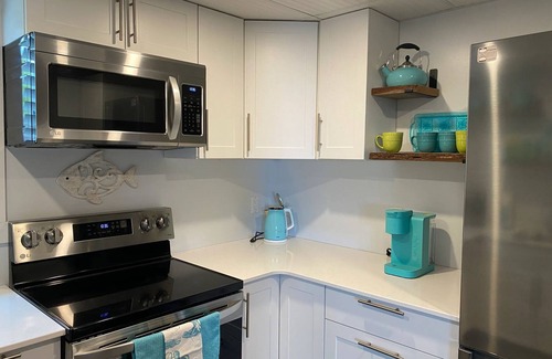 This is your home away from home, beach themed, beautiful colours and amazing ocean views with your own outside patio space with bbq and fire pit and fireplace