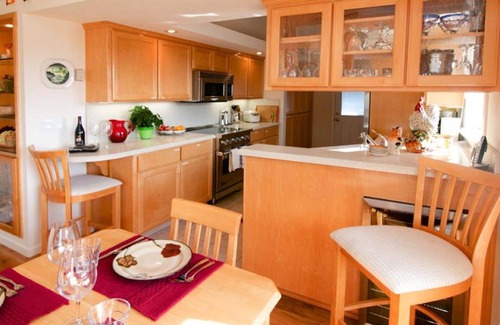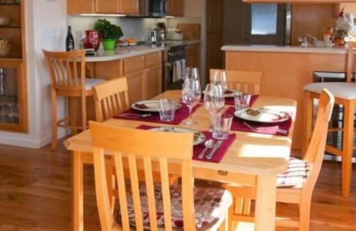 The modern GOURMET KITCHEN is equipped with all Viking appliances, and dishwasher. All cookware, cooking utensils, dishes, and silverware are provided. The dining area table seats up to 6 guests.