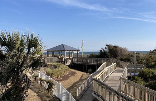 Family resort ocean view condo. 1 Master Bedroom with an additional sleeping den with bunk beds. Sleeps 5, best for no more than 4 adults. Boardwalk ramp to beach, indoor pool and outdoor pool with giant slide, hot tubs, tennis and basketball courts. 1/4 mile from Fort Macon State Park. Close to great restaurants and local attractions. Gated community. Linens, beach towels, 2 boogie boards, cooler, beach chairs, umbrella, all provided! Beautifully renovated. Elevator and luggage carts available. Kitchen stocked with all essentials including Keurig coffee maker and K-cups for guests. Outdoor gas grills and firepit.