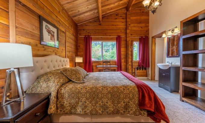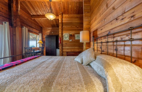 - Ocean View Log Lodge with queen bed. Hot breakfast included.