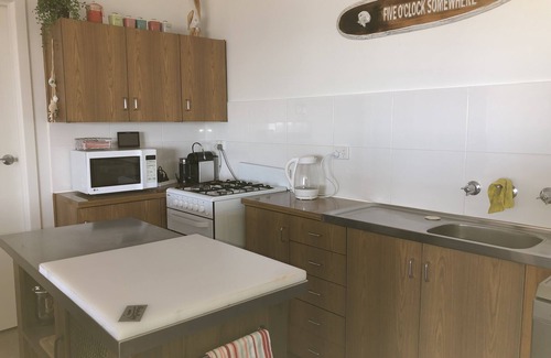 Open plan lounge/kitchen/dining with 50" TV , fully equipped kitchen inc. dishwasher, Nespresso coffee pod machine (so stock up on some pods before you come), huge fridge/freezer and a glass sliding door overlooking Venus Bay.