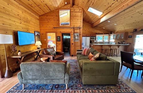 The Redstone House comfortably sleeps 12, was remodeled in 2012 and customized with artisan tile accents. Towering redwoods surround it and feature a red sandstone patio with a fire pit surrounded by tile mosaics from the Catalina Island seawall. Just a few feet from that lies our black granite wood-fired pizza oven. The home offers a master bedroom with a California king bed, an adjacent bathroom with a bath and shower, a guest room with one queen bed and a twin bed, a second bathroom with shower, two loft bedrooms accessible via ladders that each have two twin beds, and a separate downstairs room that sleeps 3, with one queen bed and a twin bed, accessible via sliding glass doors at the back of the home. The downstairs room is separated from the rest of the home.