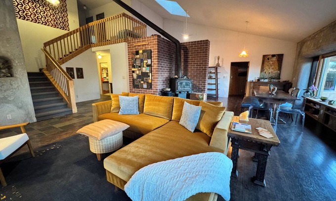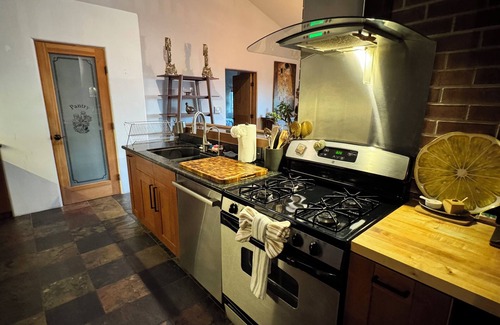 The Adobe House comfortably sleeps 8, was constructed in 2006 and is an off-grid home that runs on solar power with an automatically running propane generator backup. Central heating is provided throughout the house. The Adobe House is located a 5 minute walk or a 1 minute drive from the other house in this listing, the Redstone house. The Adobe house offers a master bedroom with a king bed, an adjacent bathroom with a bath and shower, a guest room with one queen bed, a second bathroom with shower, and a third bedroom with twin bed + japanese floor mattress.