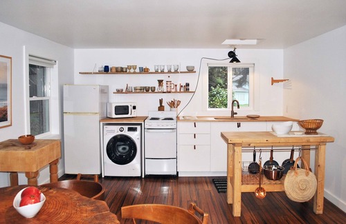 Listen to the babbling of nearby Ten Mile Creek or the ocean waves which will lull you to sleep in the luxurious king bed. Relax on the sofa and enjoy the soothing and sophisticated decor. The open floor plan invites you to enjoy conversation and cooking together where you can whip up a favorite meal or gather take out at one of the coasts' fantastic restaurants.
