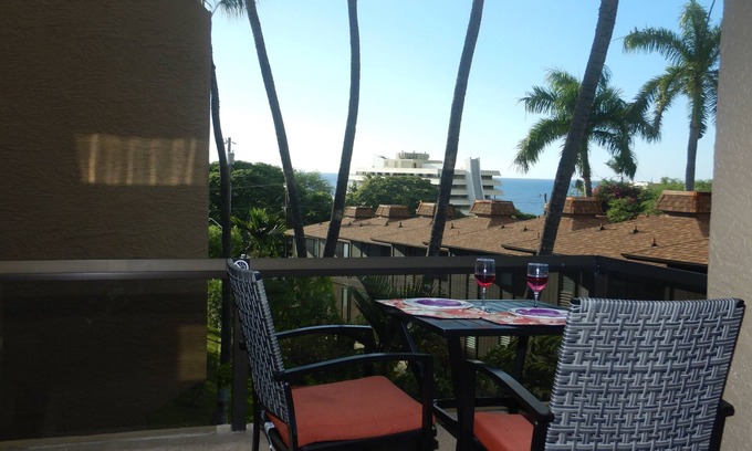 Our spacious 2 bed 3 bath condo has ocean views, not only from our huge wrap around lanai, but while sitting on the couch in the living room. Situated on the third floor of a clean and well maintained complex, our unit is on the quiet side of the building away from parking and pool noise and easily accessible from the elevator.