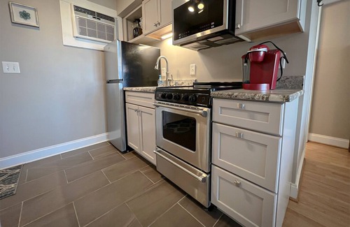 The apartment includes a comfortable Queen-sized bed and a deep mattress fold-out futon along with a full bathroom with a walk-in shower. The stocked kitchen offers a refrigerator, oven, stove top, microwave, Keurig coffee maker. A large flatscreen smart TV and dining table with seating for 2 is also available for your enjoyment.