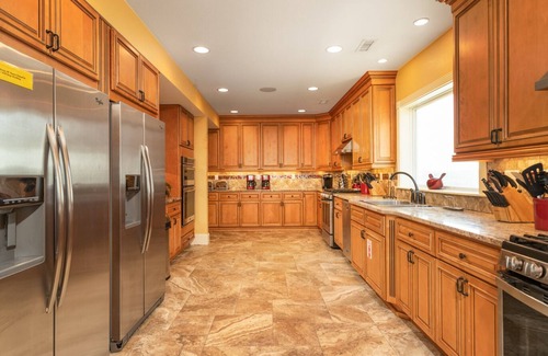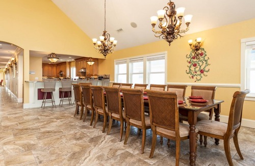 This magnificent property is replete with amenities designed to elevate your wedding experience. Enjoy a private pool with a waterfall feature, two hot tubs, and an exquisite poolside cabana equipped with a full-size kitchen. Entertain guests in the spacious rec room featuring a theater room, billiards, shuffleboard, and foosball. The gourmet kitchen, complete with multiple ovens and gas cooktops, allows for seamless meal preparation. After the ceremony, retreat to the beautifully appointed common areas or unwind in one of the many luxurious master suites, each with its own private bathroom, ensuring comfort for every guest.