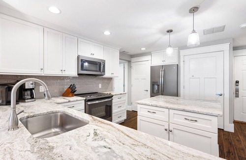 Two bedrooms (1 King, 2 Queens) each boast the comfiest bed linens we could find, with fluffy pillows as well as all digital TVs. Two full, en suite bathrooms are fully renovated and sparkling clean. There is laundry in unit.