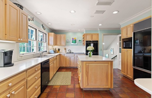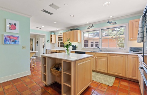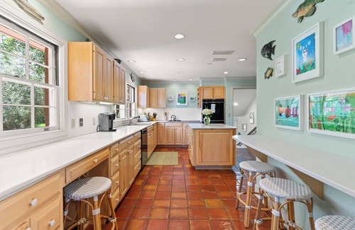 Just off the two dining rooms is the kitchen. This kitchen is filled with natural light and is fully stocked, making it easy for you to cook at home during your stay. There is an oversized fridge and freezer, double ovens, and even a bar area with barstools to the right, as you enter the kitchen.