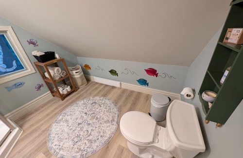 Plus: large private hallway & foyer with well-stocked beverage bar (mini fridge, tea, coffee, water, utensils, mugs, glasses), bistro sitting area, historic wall map of the area, local artwork, lots of pamphlets and brochures to help you with your travels!