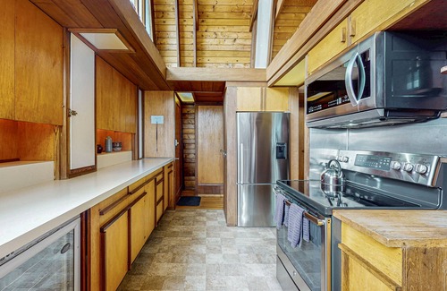 Whether you choose to spend your days reading by the fireplace (wood is provided), sharing photos on the free WiFi, or dining outside on the deck, you'll feel right at home in this elegant space. Prepare breakfast in the mod-style kitchen, soak in a few rays of sun in a lounge chair on the deck, and choose a Netflix favorite to watch with your loved ones each night. Please note that the adjacent, two-bedroom main house is available for rent as well (the two homes are connected via the garages), and that both units can be rented together as the four-bedroom Mid-Century Elk.