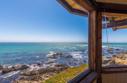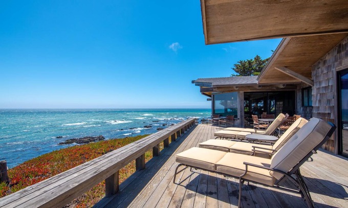 Stunning ocean views from the best location in town! RUSTIC with a nautical touch is the theme of this spectacular OCEAN FRONT home. Being one of the original ocean front homes, you'll enjoy the true feel of old Cambria. That being said, this home has not been updated, if you prefer a new, white, beach themed rental this is not the home for you. This is a very popular vacation rental, but it's not for all. Please look carefully at the pictures, they represent the home well. This spacious single level home has two bedroom, three baths and sits on the farthest extending bluff in Cambria, thus lending unobstructed views all the way up and down the coast line. Watch the whales, dolphins and other marine life while sipping a glass of wine out on the spacious deck. The living and dining areas also have a full ocean view so you can cozy by the fireplace and watch the ever changing sea on the cooler winter days. In the master bedroom, open your slider facing out to sea, and lounge with a cup of coffee and soak up the sun and fresh morning air. The house also has a lovely 6' fence around the large yard, giving you a very private experience.