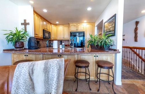 -A fully equipped kitchen with microwave, coffee maker, dishwasher and bar stool seating at kitchen counter.