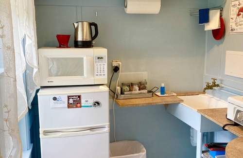 Bathroom is private with a tub/shower and the kitchenette is furnishedwith a small refrigerator, microwave, toaster, tea/coffee kettle, and hotplate.