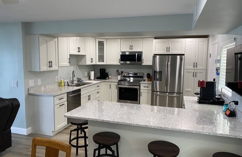 The living room features a two-person leather love seat, Leather Recliner, and 3-person recliner couch. 85" Samsung HDTV Smart TV and a ceiling fan. Hardwire for steaming. Most of the electrical outlets in the condo are wired for cellphone chargers.