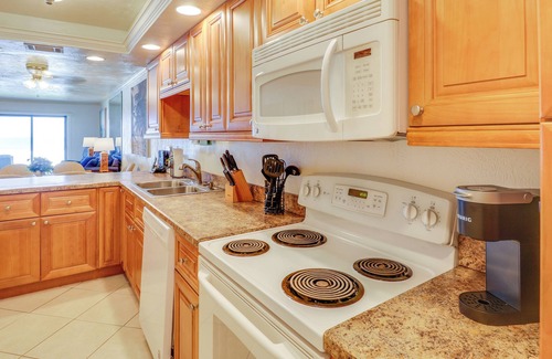 The fully equipped kitchen is stocked with everything you need to whip up meals between beach adventures, while the in-unit washer and dryer make longer stays a breeze.