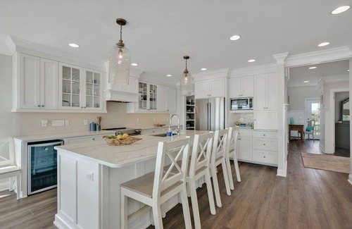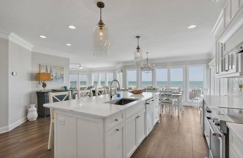 This beautifully appointed home features a range of amenities tailored for large groups, ensuring comfort and convenience throughout your stay. Each of the six bedrooms boasts its own bathroom, providing privacy for all your guests. Enjoy preparing meals in the spacious kitchen, equipped with a new 5-burner Kitchenaid Gas Range, oversized pantry, and additional under-counter beverage refrigerator. After a day of wedding festivities or beach activities, unwind on the oceanfront deck with comfy outdoor furnishings, or take a dip in the private heated swimming pool (heating available for an extra charge). Plus, you will find beach chairs, pool floats, and sand toys ready for your enjoyment, making this a truly all-inclusive retreat.