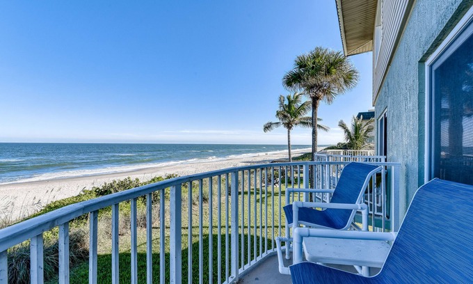 Direct Oceanfront Beach house, 5 steps from the beach, Big Blue View is a rare tropical paradise .Wake up to the sounds and smell of surf with nothing between you and the beach, in this spacious ,serene, tastefully furnished, premium beach house with 2 bedrooms, 2 bathrooms. Dine on the waves from a designer kitchen/living room. On-the-ocean balcony affords views of turtle nesting, dolphins, surfers and kite surfers , NASA rocket launches and more! Sip your morning coffee watching spectacular oceanfront sunrises. Relax with sunset evening drinks on your balcony over the ocean. Watch turtles nesting ,take a sunrise walk on the beach ,or get some early morning fishing ,all directly in front of your beach house! Heated pool, laundry & private parking are at your disposal.