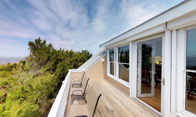 The Doc House is a waterfront property, with spectacular spectacular 360 views of the ocean, marsh, and maritime forest. This house is set within the evergreen maritime forest that is part of the natural beauty of Bald Head Island and is protected by conservation regulations. The maritime forest provides protection to the island during storms, is a habitat for island wildlife, and offers shade and privacy to the lower porch. Enjoy your own PRIVATE BEACH BOARDWALK with amazing sunset views.