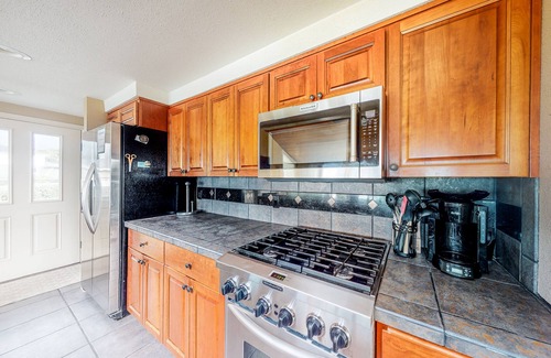 Come up from the beach each afternoon to be greeted by a spacious deck overlooking the ocean, where you can settle in for a soak in the private hot tub or sit down with a cold drink and a view of the water. Step inside to find an airy and open great room with lofty, natural wood ceilings and large picture windows that frame the beach. Toss your swimsuits in the private washer/dryer, warm up by the gas fireplace as you kick back on the soft leather sofas, and find a movie on cable or Netflix to watch on the wall-mounted flatscreen TV. Come dinnertime, you'll have a fully appointed kitchen with stainless steel appliances and such helpful bonus tools as a slow cooker, a rice cooker, and an espresso maker. The spacious island breakfast bar, which opens to the living room, provides ample seating for both prepping and dining, with additional space available around the four-person dining room table.