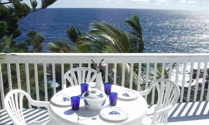 Oceanfront upstairs of home on the gorgeous "Red Road" and a short walk to a black sand beach. Quiet and serene yet modern in a natural tropical setting. Wake up looking at the waves, watch a pod of dolphins swim by. Have your coffee on the private outside deck overlooking the ocean. Fast Wireless Internet.