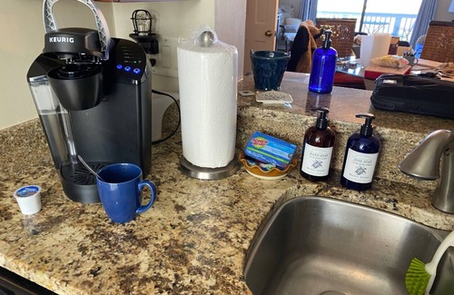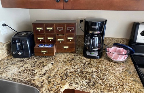 The kitchen was remodeled in 2018 with new cabinets, countertops, and flooring. The LG Washer and Dryer were updated in 2021 and the LG dishwasher in 2023. The hosts have added a Keurig and a Margaritaville mixer to make it a little easier to relax!
