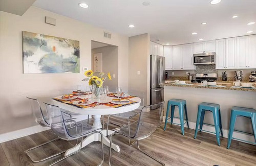The modern kitchen is fully equipped with everything you need, from appliances to ample counter space, perfect for whipping up a delicious breakfast before your day of beach fun. Both bedrooms are outfitted with queen-sized beds, flat-screen TVs, and ceiling fans, ensuring a restful stay. The unit comfortably accommodates 6 guests, with the addition of a queen sleeper sofa in the living area. While this unit doesn't offer ocean views, it's just a short walk to the sand, providing the ideal quiet retreat in the heart of Newport Beach.