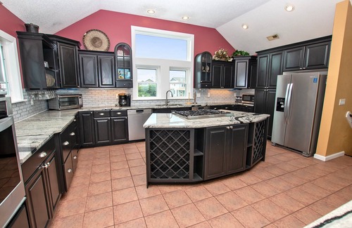 Mid Level: 2 King Master Bedrooms each with flat-screen TV, private bathroom (1-with whirlpool tub) and pool deck access. Queen Master Bedroom with flat-screen TV and private bathroom, Master Bedroom with 2 Bunk Sets, flat-screen TV and private bathroom, and a Master Bedroom with 2 Singles, flat-screen TV and a private bathroom. Laundry room with utility sink, full-size refrigerator, deck access and washer /dryer.