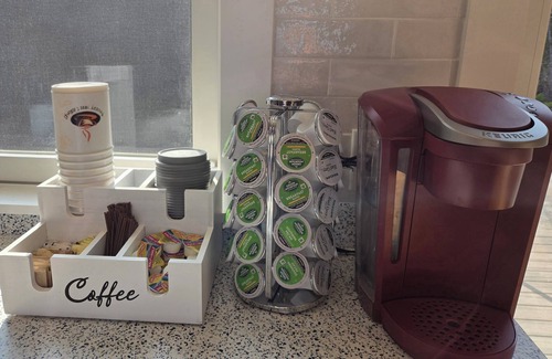 • Chef-ready kitchen with large island and barstools, stainless appliances, lobster pot, sharp knives, Keurig coffee maker, basic pantry staples.