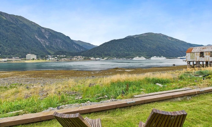 Step outside to the flat yard and you’re just 8 steps from the rocky beach. Watch the cruise ships glide into Juneau, take in the mountains rising above the Gastineau Channel, and spot eagles perched in the nearby trees. The view stretches across to downtown Juneau and the Goldbelt Tram.
