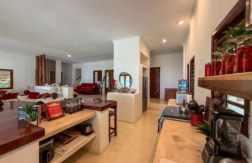 Experience the perfect blend of barefoot luxury and natural beauty at Casona Palms, a beachfront villa set on one of the last undeveloped stretches of the Mexican Caribbean near Mahahual (Costa Maya). With 3 beautifully appointed bedrooms, 3.5 baths and room for up to 8-10 guests, this serene hideaway offers privacy, comfort, and access to some of the region's most spectacular natural wonders. Crafted with natural materials and a commitment to comfort, Casona Palms features custom concrete architecture, hand picked decor, and luxury textiles throughout. Every space has been created to offer a comfortable coastal experience. Open concept great room with ocean views and hand carved furniture with 3 double doors to the outdoor terrace and direct access to 185 feet of private beach. The fully equipped kitchen provides cookware, Ninja blender, juicer, microwave, coffee maker and grinder, full size refrigerator and toaster plus all new tableware, cutlery and handblown Mexican glassware. The dining area seats 8 plus island seating for 6 - perfect for group meals. Wake up to the sound of the ocean and palm trees with sweeping views of the Caribbean from the private bedroom suites which include the Main Villa: second floor Master Suite with king bed, ensuite bath with double vanity and large walk-in shower, private oceanfront terrace with daybed and seating, gel memory foam topper, 650 thread count linens and down pillows and comforter, sleeps 2. Main Villa: second floor Double Guest Suite with two full beds, ensuite bath with double vanity and large walk-in shower, private ocean terrace with 2 sun loungers, 500 thread count linens, down/down alternative pillows and down comforter plus couch that converts to single bed, sleeps 4-5. Detached Casita: private main floor king suite with ocean view patio and seating area, ensuite bath with double vanity and large walk-in shower, gel memory foam topper, 650 thread count linens, down pillows and comforter, sleeps 2. Enjoy outdoor dining on the expansive oceanfront terrace with handcrafted wood dining table and chairs to seat 8 plus wood loungers. Beachfront grill and outdoor shower with 4 barstools for lounging while you grill - caretaker will light the grill at your request and can help source fresh fish and lobster in season. Shaded king beach bed, perfect for ultimate relaxation plus hammocks and loungers for beach lounging. Activities include beach volleyball - set up on request, 2 kayaks and 2 paddleboards for exploring the calms waters, swim spots and snorkeling just steps away (walk north to find deep sandy bottomed swimming spots) plus fishing and snorkeling at the reef which is approximately 500 yards off our beach. Don’t miss the amazing stargazing at night and breathtaking sunrises. Our villa is seamless off-grid living and is designed to operate sustainably without sacrificing comfort. The villa has a solar powered energy system with backup generator, filtered rainwater system with 10,000 gallon cistern (plus bottled drinking water provided), Wi-Fi via Starlink for reliable internet and Wi-Fi calling. Please note there is no A/C as the home was custom built for natural ventilation, with breezy crosswinds and fans in every room. No television so bring a laptop for streaming or enjoy unplugged evenings by the sea. Your stay is supported by our discreet, full time caretaker, who lives on-site in a private residence with his wife. He provides daily beach raking and clean-up (note that during sargassum season, it can be difficult to clear the beach completely depending on currents and wind), daily trash removal, fresh towel/linen service upon request and grill prep and sourcing local seafood (charcoal briquettes provided). Optional laundry service is available on Saturday and must be arranged with caretaker for an extra fee. Optional meal services available for evening dinners and on weekends for an extra fee. Explore the nearby activities in Mahahual which is just 35 minutes away. The vibrant beach town of Mahahual offers a mix of local charm and tourist amenities. Walk the Malecon, a beachfront promenade with casual restaurants, beach bars and markets. Take a dive or snorkeling trip to the Mesoamerican Barrier Reef, the second largest reef in the world. Book a fishing charter or paddle board lesson. Massages are available on the beach daily at many locations on the Malecon. Visit nearby Bacalar to see Laguna Bacalar, the lagoon of seven colors (saltwater lake ranging in color from light turquoise to the deepest blue). Spend a day exploring the nearby Mayan ruins. Our guest book will provide more information on dining, shopping and tours. Special note: This villa has been on Vrbo in the past by the previous owner with 10/10 reviews. We are the new owners and have been working hard this summer on updates and improvements to make your stay even better. Mexico is a special place to us and our goal is to provide you with a lovely beachfront stay with great communication and service! Car rental is recommended. We are a 2.5 hour drive from the new Tulum International Airport or 4 hours from Cancun International airport. Maya Tren (train), ADO bus and private transfers are available. Mahahual has taxi service for local transportation.