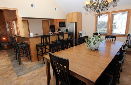Top Level: Living area with flat-screen TV/DVD, stereo with CD and wood fireplace, half bath, kitchen, dining room seating 16, King Master Bedroom with deck access.