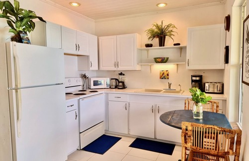 Enjoy beautiful sunsets and sunrises in this cozy two bedroom, one bath house nestled in a private tropical garden on the oceanfront. A fully equipped kitchen, 2 rainwater tanks, a spacious living room with ocean views, and a covered patio to relax in the ocean breezes, promising you a relaxing and memorable beach vacation. Cable TV and WiFi. Quiet neighborhood. A 5 minute walk to popular beach-side Sandbar Restaurant. Kayaks and paddle boards to enjoy in the ocean.