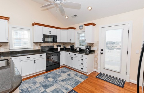 Top Level: Great room with large flat-screen TV/BluRay DVD and deck access. Kitchen with counter seating for 4 and deck access, dining area seating 10 with deck access, sitting area including a children's library with deck access and a half bath. King Master Bedroom with flat-screen TV and deck access.