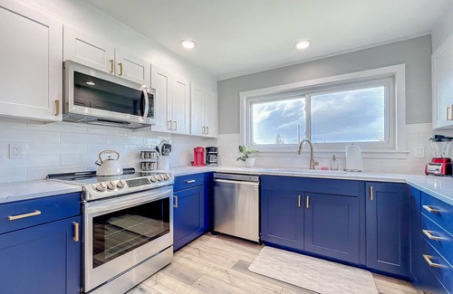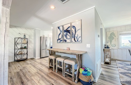 The fully equipped kitchen features gorgeous white granite countertops, stainless steel appliances, and all your cooking essentials including Keurig and drip coffee maker, crock pot, kettle, blender, air fryer, toaster, and more! Everything you'll need to prepare meals by the oceanside is available for your use. The dining room table has seating for 8, with additional seating for 3 available on a bar top along the wall that adjoins the kitchen. The half bath is located in the hallway that merges the kitchen with the open dining room.