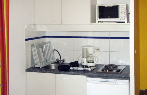 " Odalys Essentielle Le Grand Bleu", 2-room maisonette 30 m2. Object suitable for 4 adults. Living/sleeping room with 1 sofabed, dining table, TV and electric heating. Exit to the terrace. 1 room with 1 french bed. Kitchenette (2 hot plates, microwave, electric coffee machine). Shower, sep. WC. Upper floor: open gallery with sloping ceilings with 2 beds. Patio 9 m2. Terrace furniture. Facilities: iron, children's high chair, baby cot. Internet (WiFi, extra). Please note: non-smoking house. Maximum 2 pets/ dogs allowed. Smoke alarm. Instead of an enclosed bedroom, some sleeping areas are located in an open-plan area (gallery, alcove, etc.).